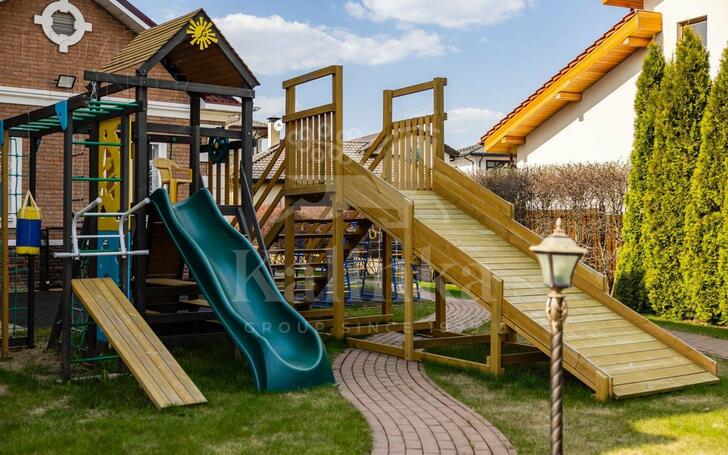 На участке летнее барбекю, дом для персонала, парковка на 2 м/м, оборудованная детская площадка.