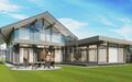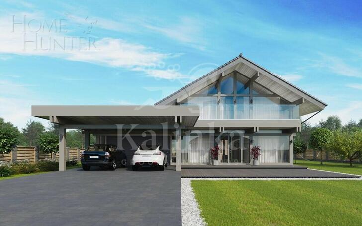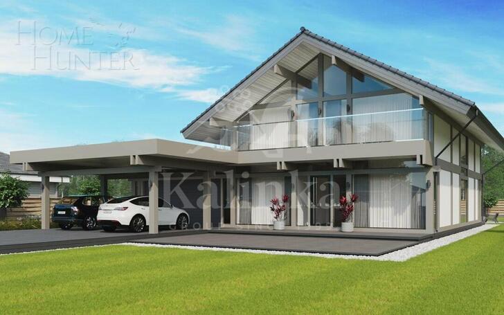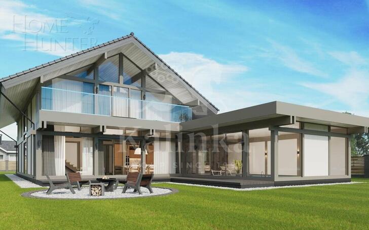 Дом в стиле Фахверк площадью 466 кв. м расположен на участке 17 соток в коттеджном охраняемом поселке.