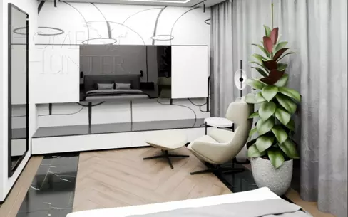 1-й этаж: прихожая, гостиная со вторым светом, кухня-столовая, гостевая спальня с с/у, гостевой с/у, детская спальня с с/у и гардеробной, комната няни с с/у, холл, хоз. помещения; блок персонала: кухня, спальня, с/у, постирочная; 2-й этаж: мастер