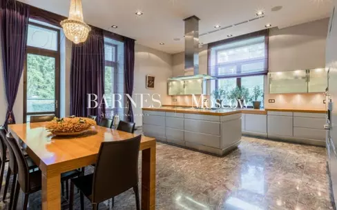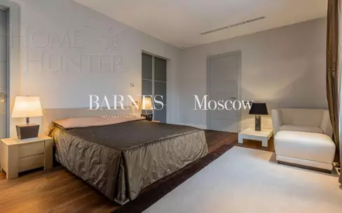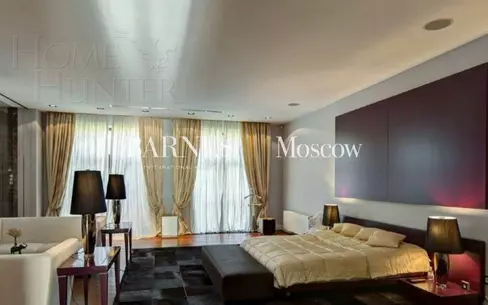 На лесном участке 55 соток с ландшафтным обустройством, на котором растут вековые сосны, расположена загородная усадьба площадью 1500 метров. Коттедж имеет уникальную архитектуру, построен по индивидуальному проекту. Отделка дома выполнена в