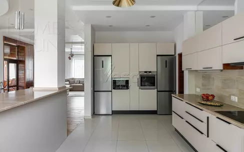 Фундамент дома свайно-ленточный, стены выполнены из газоблоков. В доме 4 спальни, 3 санузла, просторная кухня-гостиная со вторым светом, котельная-постирочная, кабинет, на мансардном этаже большая детская игровая, хозяйственное помещение для вещей и