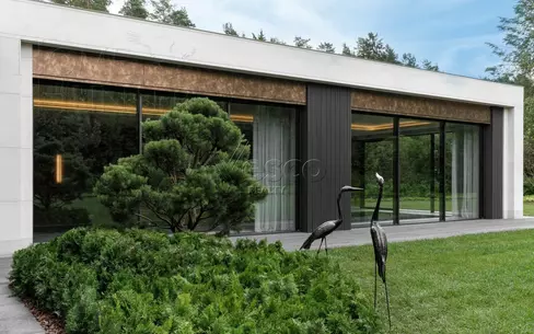 ID 3292. Дом: Загородный дом площадью 550 м2 построен на просторном участке 22 сотки. Райтовский фасад здания облицован коричневым клинкерным кирпичом и декорирован подсветкой. Благодаря большим окнам в пол пространство наполнено воздухом и
