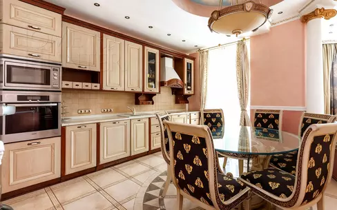 Двухуровневая квартира площадью 278 кв. м. Расположена на 12-13 этажах современного жилого комплекса в историческом центре Москвы. Отделка выполнена в стиле исторического модерна с использованием дорогостоящих натуральных и эко- материалов. Первый